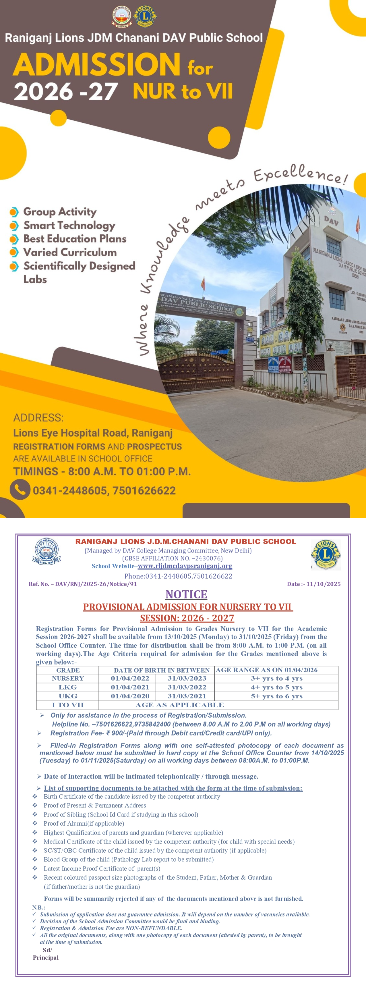 RANIGANJ LIONS J.D.M.CHANANI D.A.V PUBLIC SCHOOL Lions Eye Hospital Road P.O.- Raniganj Paschim Bardhaman, WEST BENGAL - 713347, E-mail : [email protected] Website : www.rljdmcdavpsraniganj.org Contact No. : 0341-2448605