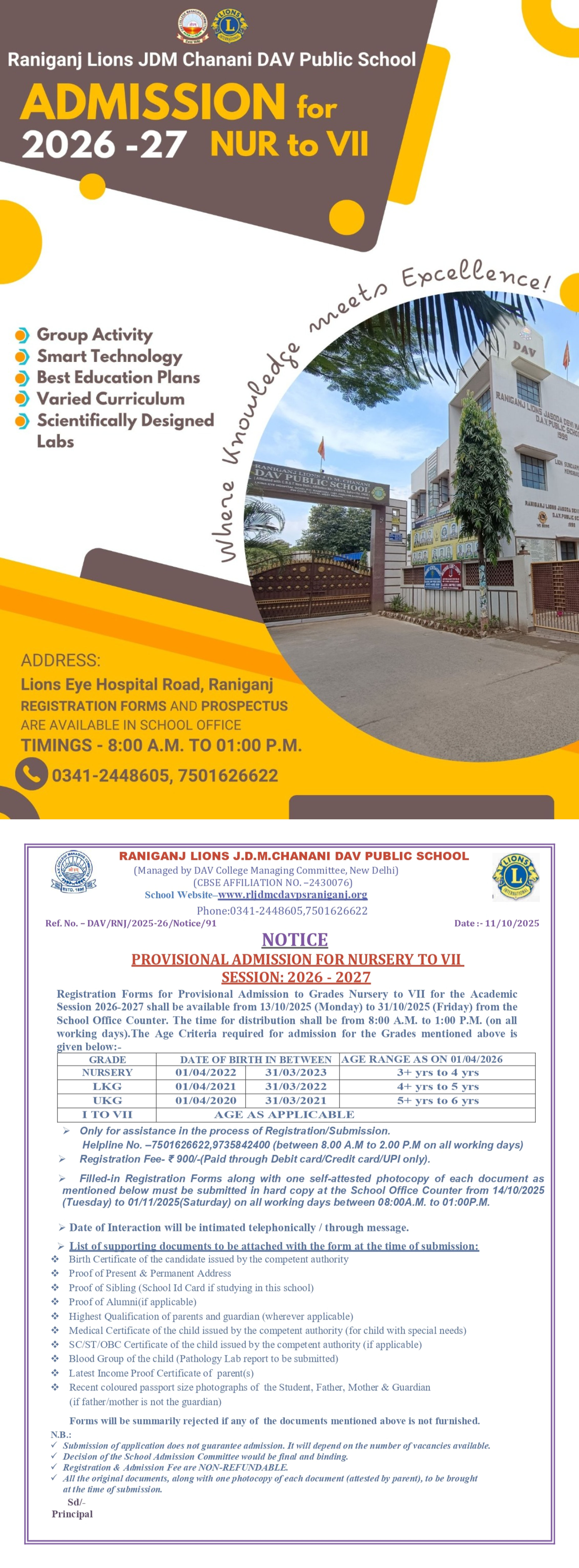 RANIGANJ LIONS J.D.M.CHANANI D.A.V PUBLIC SCHOOL Lions Eye Hospital Road P.O.- Raniganj Paschim Bardhaman, WEST BENGAL - 713347, E-mail : [email protected] Website : www.rljdmcdavpsraniganj.org Contact No. : 0341-2448605